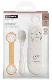 Suavinex pack cuchara + portacuchara + sujetababeros, con un diseño ergonómico ideal para la papilla y los potitos de los bebés de más de cuatro meses.