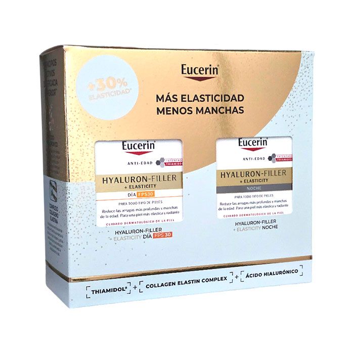 El pack Eucerin Hyaluron Filler Elasticity está formulado para combatir los signos del envejecimiento, proporcionando una hidratación intensa y mejorando la elasticidad de la piel. Este tratamiento incluye una crema de día con protección solar SPF30 y una crema de noche, diseñadas para actuar en sinergia y ofrecer resultados óptimos.