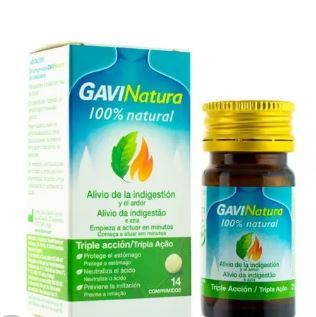 Gavinatura 14 Comprimidos. Gavinatura es un producto sanitario, complemento alimenticio 100% natural, para el alivio de la indigestión y el ardor. Tiene triple acción: 1. Protege el estómago. 2. Neutraliza el ácido. 3. Previene la irritación. Tiene un mecanismo de acción innovador. Refuerza los sistemas de defensa naturales del organismo, creando una película protectora que recubre la mucosa del tracto gastroesofágico, reduciendo así su contacto con los jugos gástricos y otros irritantes. Empieza a actuar en minutos. Gavinatura 14 Comprimidos INDICACIONES: Para adultos y niños mayores de 6 años. Para utilizar en caso de ardor, indigestión, dolor de estómago e hiperacidez gástrica. Puede ayudar a prevenir los síntomas asociados a una dieta poco saludable, al estrés y a la ingesta de medicamentos antiinflamatorios no esteroideos. Puede ser utilizado durante el embarazo y la lactancia si es necesario siguiendo las indicaciones de un profesional sanitario. COMO USARLO: Se recomienda disolver lentamente un comprimido en la boca según necesidad. En caso de ardor e indigestión, tomar un comprimido después de cada comida principal y uno por la noche antes de acostarse.