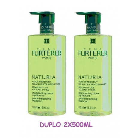 RENE FURTERER NATURIA CHAMPÚ USO FRECUENTE EQUILIBRANTE DUPLO 2X500ML NATURIA - Champú extrasuave equilibrante. Para todo tipo de cabellos. EL CHAMPÚ EXTRASUAVE DE USO FRECUENTE PARA TODA LA FAMILIA El Champú extrasuave equilibrante NATURIA aporta al pelo suavidad y ligereza respetando el equilibrio del cuero cabelludo. Su espuma untuosa lo envuelve de un perfume fresco y vegetal. PRINCIPIOS ACTIVOS La selección de las mejores plantas nos permite obtener los mejores resultados - Aceite esencial frío MENTA. La menta ha sido utilizada desde la antigüedad por sus numerosas virtudes medicinales. Los arqueólogos han encontrado flores secas de menta en las pirámides de Egipto que datan del primer milenio antes de nuestra era. El apreciado aceite esencial de menta es rico en mentol, que ejerce un efecto calmante, purificante, anti-irritante y refrescante en el cuero cabelludo. - Aceite esencial frío ALBAHACA. Las hojas de albahaca, considerada durante siglos una planta sagrada en Europa y en India por su poder de curación de heridas, contienen un aceite esencial que se utiliza desde la Edad Media. Este activo vegetal presenta muchas virtudes calmantes y tonificantes. Su olor picante y fresco le confiere propiedades aromáticas equilibrantes. - Aceite esencial frío ALCARAVEA. La alcaravea, también conocida como comino de prado, crece en climas fríos. Su fruto, de fragancia delicada, es la especia más antigua utilizada en Europa y se empleaba en Egipto para elaborar filtros de amor. El aceite esencial que se extrae de sus semillas, conocido por activar la mente y favorecer el optimismo, posee un aroma sutil y poderoso. Ha sido seleccionada por su acción purificante del cuero cabelludo y sus virtudes aromáticas. INDICACIONES